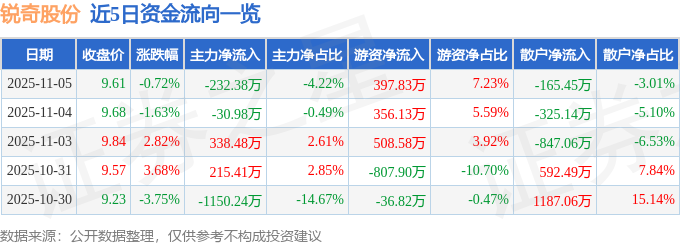 证券之星消息,截至2025年11月5日收盘,锐奇股份(300126)报收于9.61元,下跌0.72%,换手率2.7%,成交量5.69万手,成交额5500.42万元。