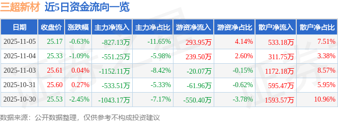 证券之星消息,截至2025年11月5日收盘,三超新材(300554)报收于25.17元,下跌0.63%,换手率3.55%,成交量2.81万手,成交额7100.9万元。