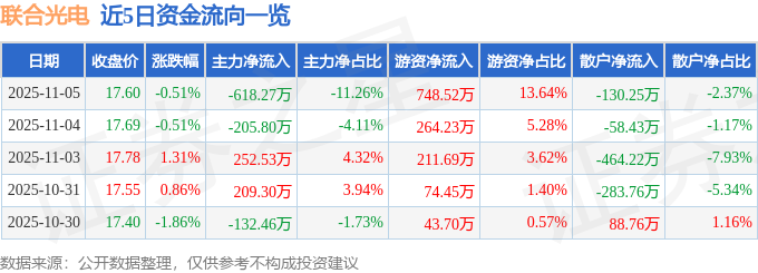证券之星消息,截至2025年11月5日收盘,联合光电(300691)报收于17.6元,下跌0.51%,换手率1.41%,成交量3.12万手,成交额5489.37万元。
