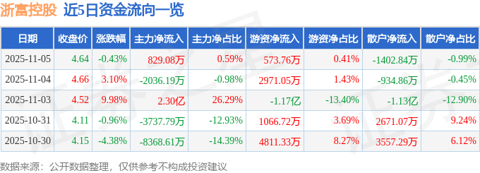 证券之星消息,截至2025年11月5日收盘,浙富控股(002266)报收于4.64元,下跌0.43%,换手率6.2%,成交量303.74万手,成交额14.15亿元。