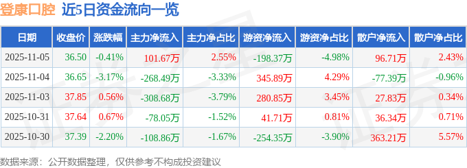 证券之星消息,截至2025年11月5日收盘,登康口腔(001328)报收于36.5元,下跌0.41%,换手率2.53%,成交量1.09万手,成交额3981.22万元。
