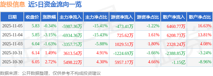 证券之星消息,截至2025年11月5日收盘,旋极信息(300324)报收于5.83元,下跌0.34%,换手率3.93%,成交量67.26万手,成交额3.88亿元。