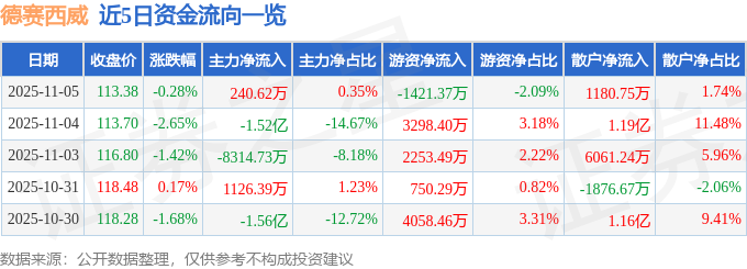 11月5日的资金流向数据方面,主力资金净流入240.62万元,占总成交额0.35%,游资资金净流出1421.37万元,占总成交额2.09%,散户资金净流入1180.75万元,占总成交额1.74%。