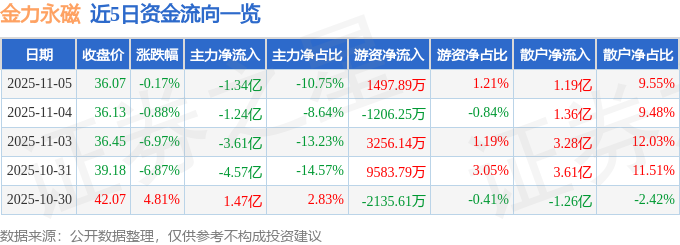 证券之星消息,截至2025年11月5日收盘,金力永磁(300748)报收于36.07元,下跌0.17%,换手率3.07%,成交量34.75万手,成交额12.42亿元。