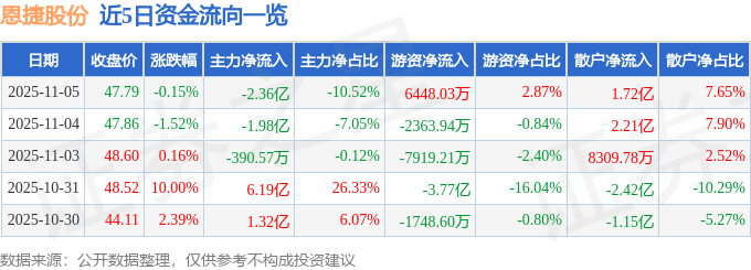 证券之星消息,截至2025年11月5日收盘,恩捷股份(002812)报收于47.79元,下跌0.15%,换手率5.85%,成交量47.32万手,成交额22.47亿元。