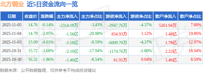 证券之星消息,截至2025年11月5日收盘,北方铜业(000737)报收于14.76元,下跌0.14%,换手率2.41%,成交量45.98万手,成交额6.74亿元。