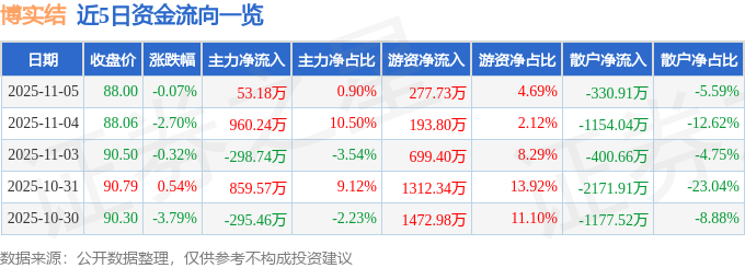 11月5日的资金流向数据方面,主力资金净流入53.18万元,占总成交额0.9%,游资资金净流入277.73万元,占总成交额4.69%,散户资金净流出330.91万元,占总成交额5.59%。