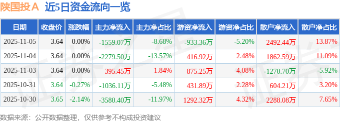 证券之星消息,截至2025年11月5日收盘,陕国投A(000563)报收于3.64元,上涨0.0%,换手率0.96%,成交量49.27万手,成交额1.8亿元。