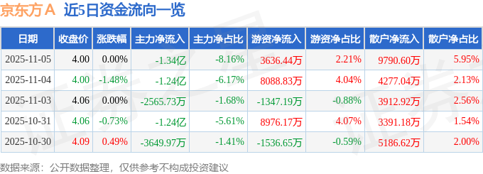 证券之星消息,截至2025年11月5日收盘,京东方A(000725)报收于4.0元,上涨0.0%,换手率1.12%,成交量412.48万手,成交额16.46亿元。