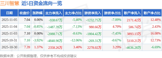 证券之星消息,截至2025年11月5日收盘,三川智慧(300066)报收于7.04元,上涨0.0%,换手率2.47%,成交量24.89万手,成交额1.74亿元。