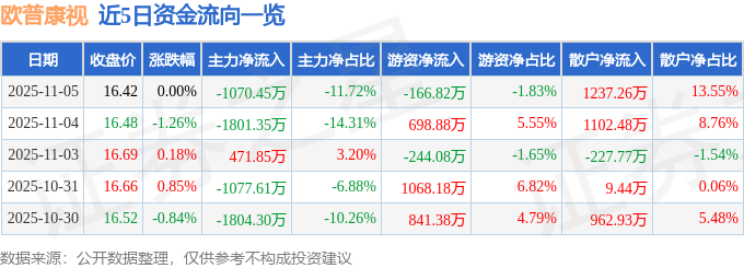 证券之星消息,截至2025年11月5日收盘,欧普康视(300595)报收于16.42元,上涨0.0%,换手率0.83%,成交量5.56万手,成交额9130.12万元。