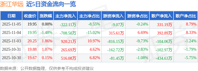 证券之星消息,截至2025年11月5日收盘,浙江华远(301535)报收于19.95元,上涨0.0%,换手率2.97%,成交量1.89万手,成交额3768.98万元。