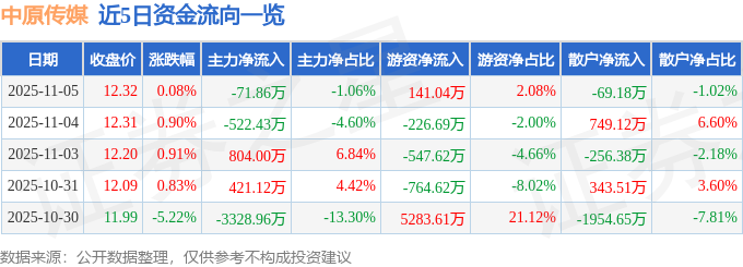 证券之星消息,截至2025年11月5日收盘,中原传媒(000719)报收于12.32元,上涨0.08%,换手率0.83%,成交量5.54万手,成交额6790.64万元。