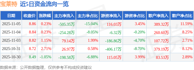 11月5日的资金流向数据方面,主力资金净流出505.35万元,占总成交额15.04%,游资资金净流入116.03万元,占总成交额3.45%,散户资金净流入389.32万元,占总成交额11.59%。