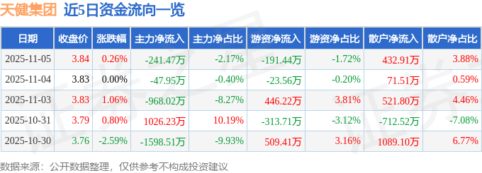 证券之星消息,截至2025年11月5日收盘,天健集团(000090)报收于3.84元,上涨0.26%,换手率1.56%,成交量29.11万手,成交额1.11亿元。