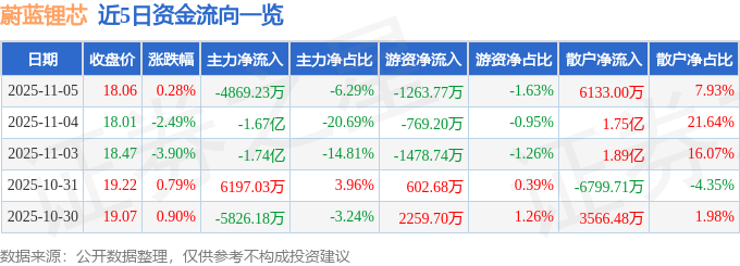 证券之星消息,截至2025年11月5日收盘,蔚蓝锂芯(002245)报收于18.06元,上涨0.28%,换手率3.98%,成交量43.23万手,成交额7.74亿元。