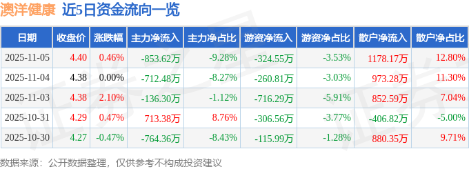 证券之星消息,截至2025年11月5日收盘,澳洋健康(002172)报收于4.4元,上涨0.46%,换手率2.74%,成交量20.97万手,成交额9201.4万元。