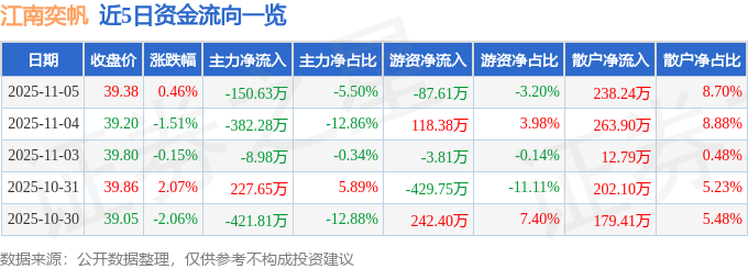 证券之星消息,截至2025年11月5日收盘,江南奕帆(301023)报收于39.38元,上涨0.46%,换手率1.66%,成交量6951.0手,成交额2739.43万元。