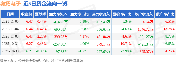 证券之星消息,截至2025年11月5日收盘,奥拓电子(002587)报收于6.47元,上涨0.47%,换手率2.69%,成交量14.18万手,成交额9158.53万元。