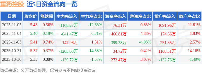 证券之星消息,截至2025年11月5日收盘,重药控股(000950)报收于5.43元,上涨0.56%,换手率0.99%,成交量17.08万手,成交额9247.29万元。