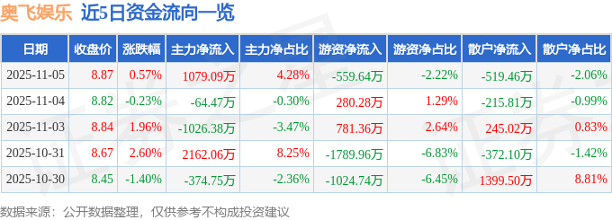 证券之星消息,截至2025年11月5日收盘,奥飞娱乐(002292)报收于8.87元,上涨0.57%,换手率2.79%,成交量28.36万手,成交额2.52亿元。