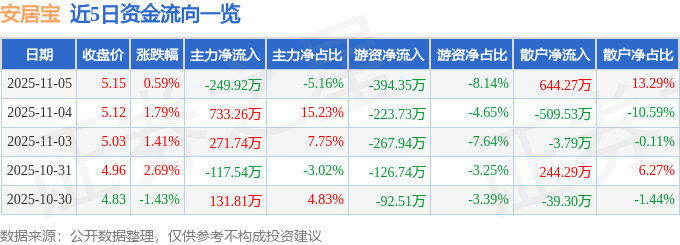 11月5日的资金流向数据方面,主力资金净流出249.92万元,占总成交额5.16%,游资资金净流出394.35万元,占总成交额8.14%,散户资金净流入644.27万元,占总成交额13.29%。