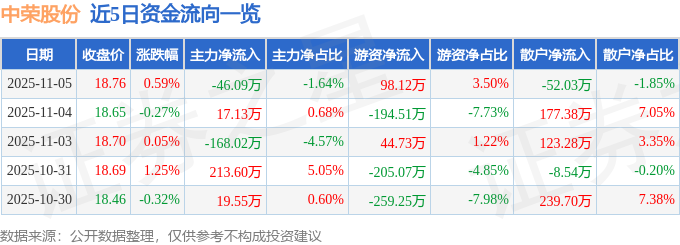 证券之星消息,截至2025年11月5日收盘,中荣股份(301223)报收于18.76元,上涨0.59%,换手率1.34%,成交量1.5万手,成交额2806.92万元。