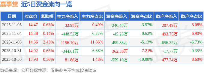 11月5日的资金流向数据方面,主力资金净流入32.95万元,占总成交额0.49%,游资资金净流出240.45万元,占总成交额3.57%,散户资金净流入207.49万元,占总成交额3.08%。