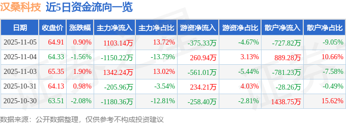 11月5日的资金流向数据方面,主力资金净流入1103.14万元,占总成交额13.72%,游资资金净流出375.33万元,占总成交额4.67%,散户资金净流出727.82万元,占总成交额9.05%。