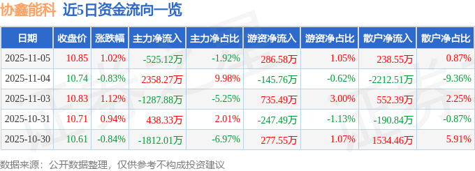 11月5日的资金流向数据方面,主力资金净流出525.12万元,占总成交额1.92%,游资资金净流入286.58万元,占总成交额1.05%,散户资金净流入238.55万元,占总成交额0.87%。