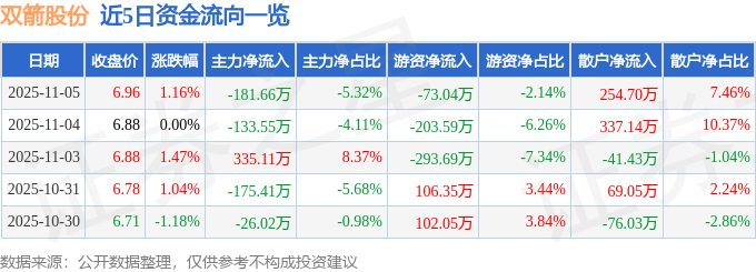 证券之星消息,截至2025年11月5日收盘,双箭股份(002381)报收于6.96元,上涨1.16%,换手率1.53%,成交量4.93万手,成交额3416.31万元。