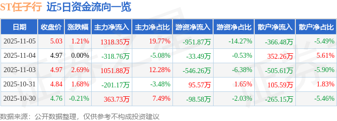 证券之星消息,截至2025年11月5日收盘,ST任子行(300311)报收于5.03元,上涨1.21%,换手率2.49%,成交量13.37万手,成交额6669.47万元。