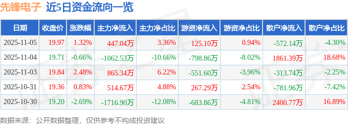证券之星消息,截至2025年11月5日收盘,先锋电子(002767)报收于19.97元,上涨1.32%,换手率5.15%,成交量6.71万手,成交额1.33亿元。