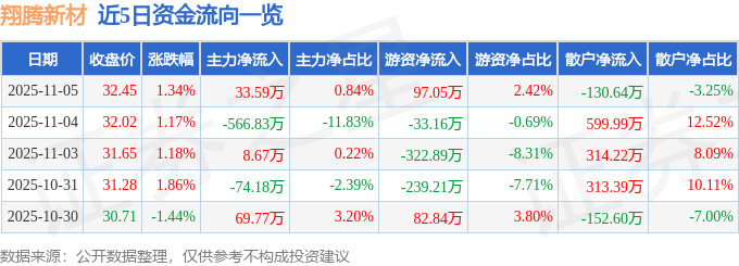 证券之星消息,截至2025年11月5日收盘,翔腾新材(001373)报收于32.45元,上涨1.34%,换手率3.75%,成交量1.24万手,成交额4014.24万元。