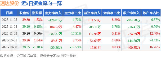 证券之星消息,截至2025年11月5日收盘,速达股份(001277)报收于39.8元,上涨1.53%,换手率4.07%,成交量1.85万手,成交额7380.42万元。