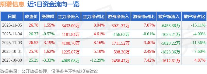 证券之星消息,截至2025年11月5日收盘,熙菱信息(300588)报收于26.78元,上涨1.55%,换手率8.93%,成交量15.78万手,成交额4.27亿元。