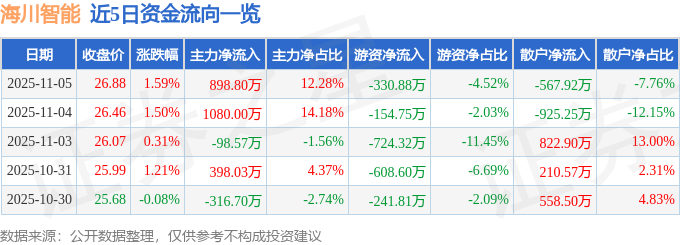 证券之星消息,截至2025年11月5日收盘,海川智能(300720)报收于26.88元,上涨1.59%,换手率1.58%,成交量2.75万手,成交额7319.13万元。