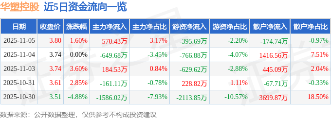 证券之星消息,截至2025年11月5日收盘,华塑控股(000509)报收于3.8元,上涨1.6%,换手率4.42%,成交量47.41万手,成交额1.8亿元。