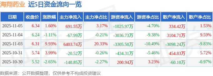 证券之星消息,截至2025年11月5日收盘,海翔药业(002099)报收于6.34元,上涨1.6%,换手率2.15%,成交量34.71万手,成交额2.18亿元。