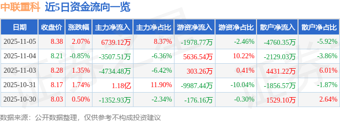11月5日的资金流向数据方面,主力资金净流入6739.12万元,占总成交额8.37%,游资资金净流出1978.77万元,占总成交额2.46%,散户资金净流出4760.35万元,占总成交额5.92%。