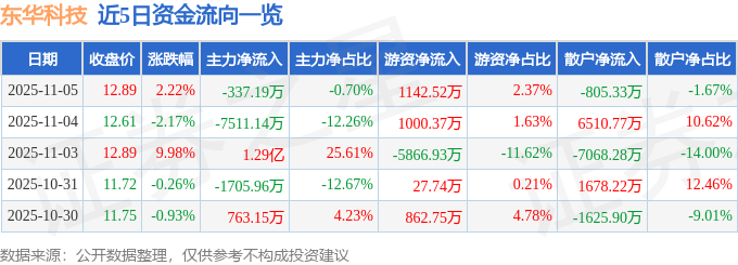 证券之星消息,截至2025年11月5日收盘,东华科技(002140)报收于12.89元,上涨2.22%,换手率6.94%,成交量37.74万手,成交额4.83亿元。