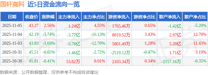证券之星消息,截至2025年11月5日收盘,国轩高科(002074)报收于43.27元,上涨2.56%,换手率3.69%,成交量64.03万手,成交额27.27亿元。