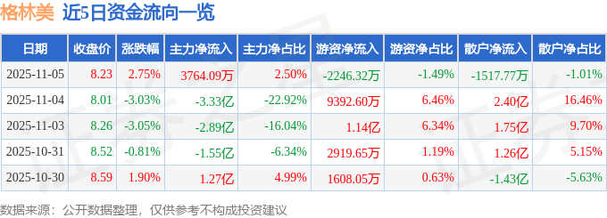 证券之星消息,截至2025年11月5日收盘,格林美(002340)报收于8.23元,上涨2.75%,换手率3.65%,成交量185.47万手,成交额15.04亿元。
