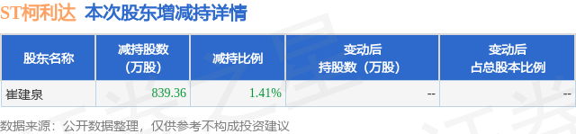 证券之星消息,11月5日ST柯利达发布公告《ST柯利达:柯利达简式权益变动报告书(出让方)》,其股东崔建泉于2025年5月4日至2025年8月13日间合计减持839.36万股,占公司目前总股本的1.4084%,变动期间该股股价下跌20.04%,截止8月13日收盘报4.35元。