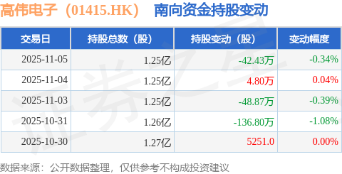 证券之星消息,11月5日南向资金减持42.43万股高伟电子(01415.HK)。近5个交易日中,获南向资金减持的有3天,累计净减持222.77万股。近20个交易日中,获南向资金减持的有12天,累计净减持571.45万股。截至目前,南向资金持有高伟电子(01415.HK)1.25亿股,占公司已发行普通股的14.36%。