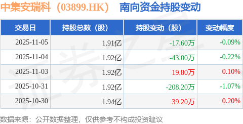 证券之星消息,11月5日南向资金减持17.6万股中集安瑞科(03899.HK)。近5个交易日中,获南向资金减持的有3天,累计净减持209.8万股。近20个交易日中,获南向资金减持的有12天,累计净减持650.4万股。截至目前,南向资金持有中集安瑞科(03899.HK)1.91亿股,占公司已发行普通股的9.42%。