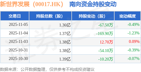 证券之星消息,11月5日南向资金减持67.5万股新世界发展(00017.HK)。近5个交易日中,获南向资金减持的有4天,累计净减持289.0万股。近20个交易日中,获南向资金减持的有14天,累计净减持856.6万股。截至目前,南向资金持有新世界发展(00017.HK)1.36亿股,占公司已发行普通股的5.39%。