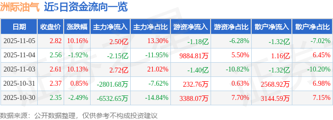 证券之星消息,截至2025年11月5日收盘,洲际油气(600759)报收于2.82元,上涨10.16%,涨停,换手率16.48%,成交量682.86万手,成交额18.83亿元。