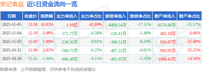 证券之星消息,截至2025年11月5日收盘,安记食品(603696)报收于13.38元,上涨10.03%,涨停,换手率8.37%,成交量19.68万手,成交额2.57亿元。