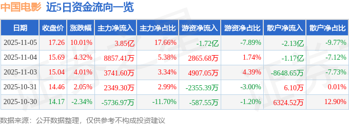 证券之星消息,截至2025年11月5日收盘,中国电影(600977)报收于17.26元,上涨10.01%,涨停,换手率7.03%,成交量131.17万手,成交额21.82亿元。